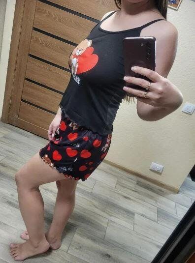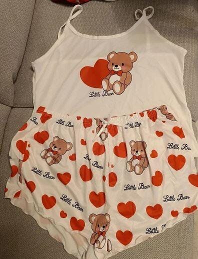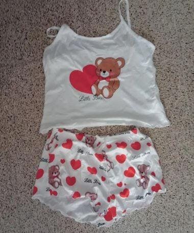 Šarmantan set pidžame s medvjedićima i srcima, s kratkim topom s volanima i okruglim izrezom u kombinaciji s udobnim elastičnim kratkim hlačama. Idealno za ugodne večeri kod kuće.